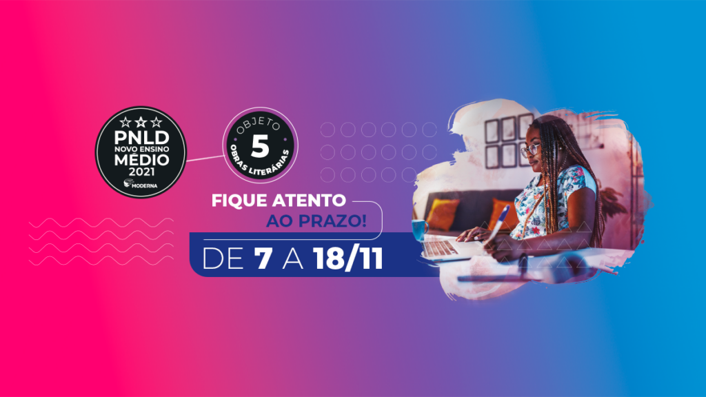 A escolha do Objeto 5 do PNLD 2021 – Ensino Médio está aberta! De 7 a 18 de novembro, sua escola poderá registrar as obras de literatura que irão compor o acervo do Ensino Médio nos próximos anos.