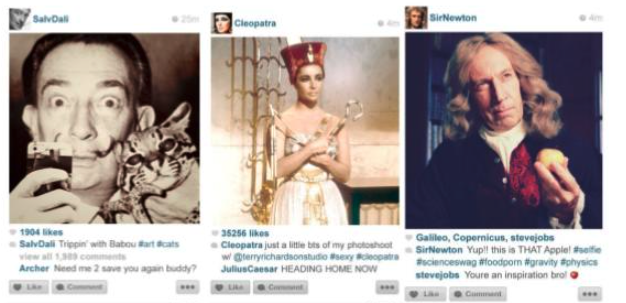 Continuando o nosso quadro de ideias, outro tópico interessante e que pode servir como forma de revisão dos conteúdos é a criação de páginas de Instagram fictícias (usando templates em PDF ou mesmo desenhando o formato no papel). Uma boa fonte de inspiração é o site Histagrams.com, veja alguns exemplos: